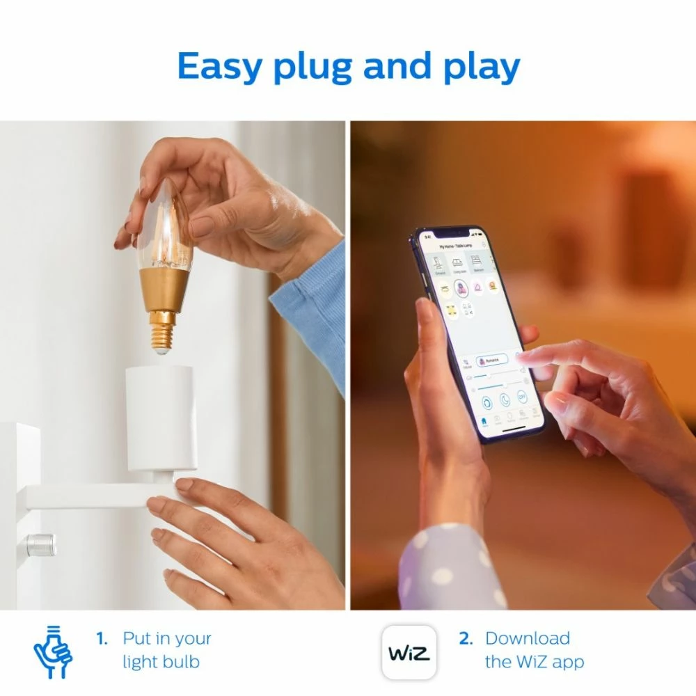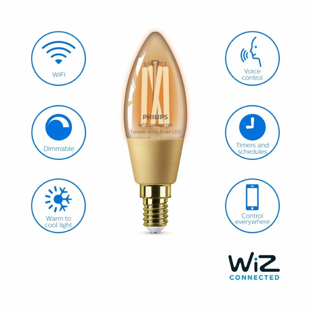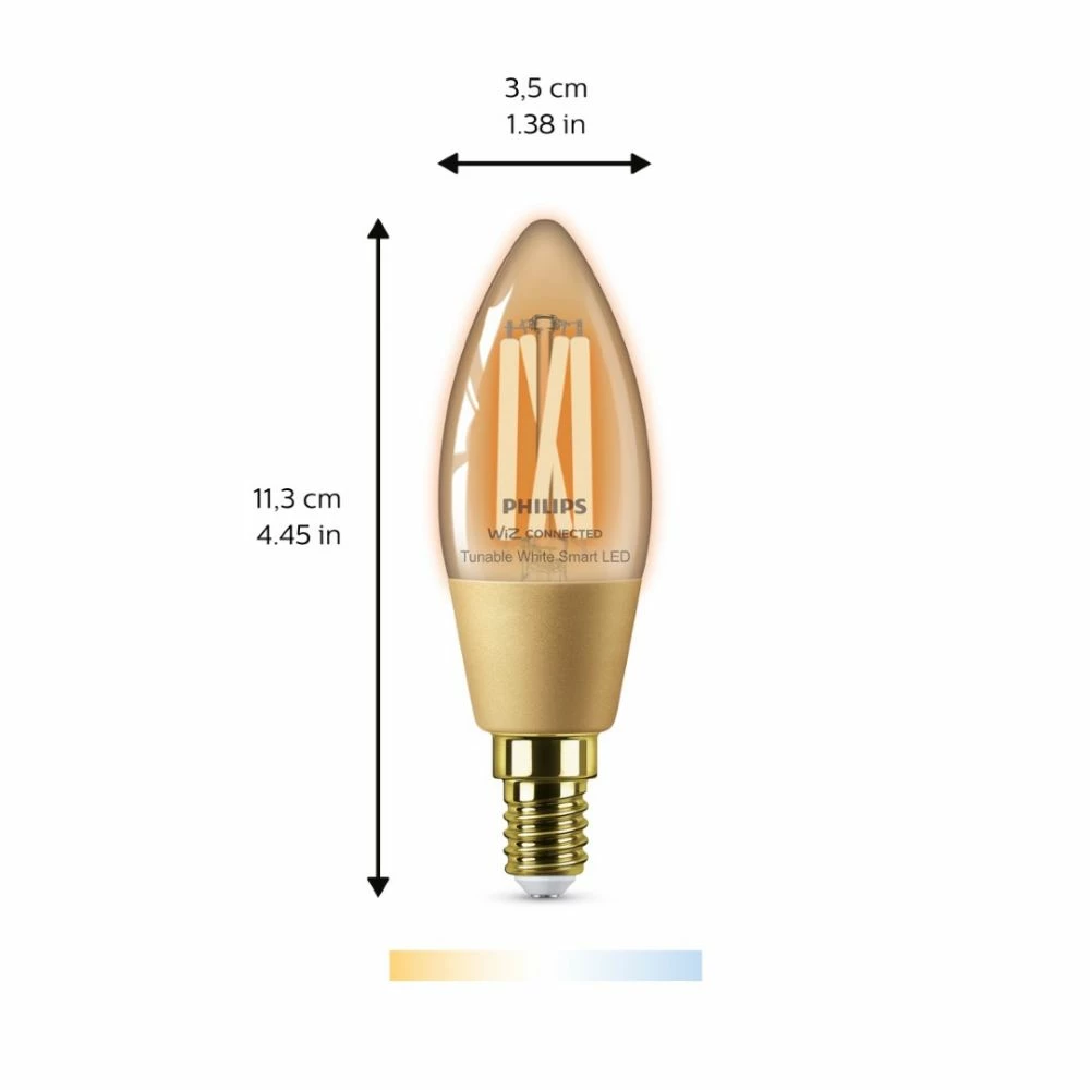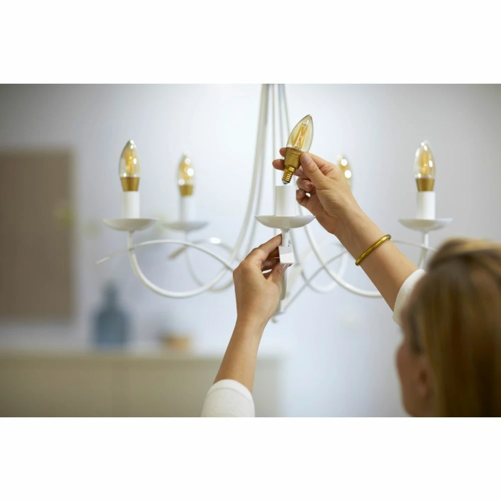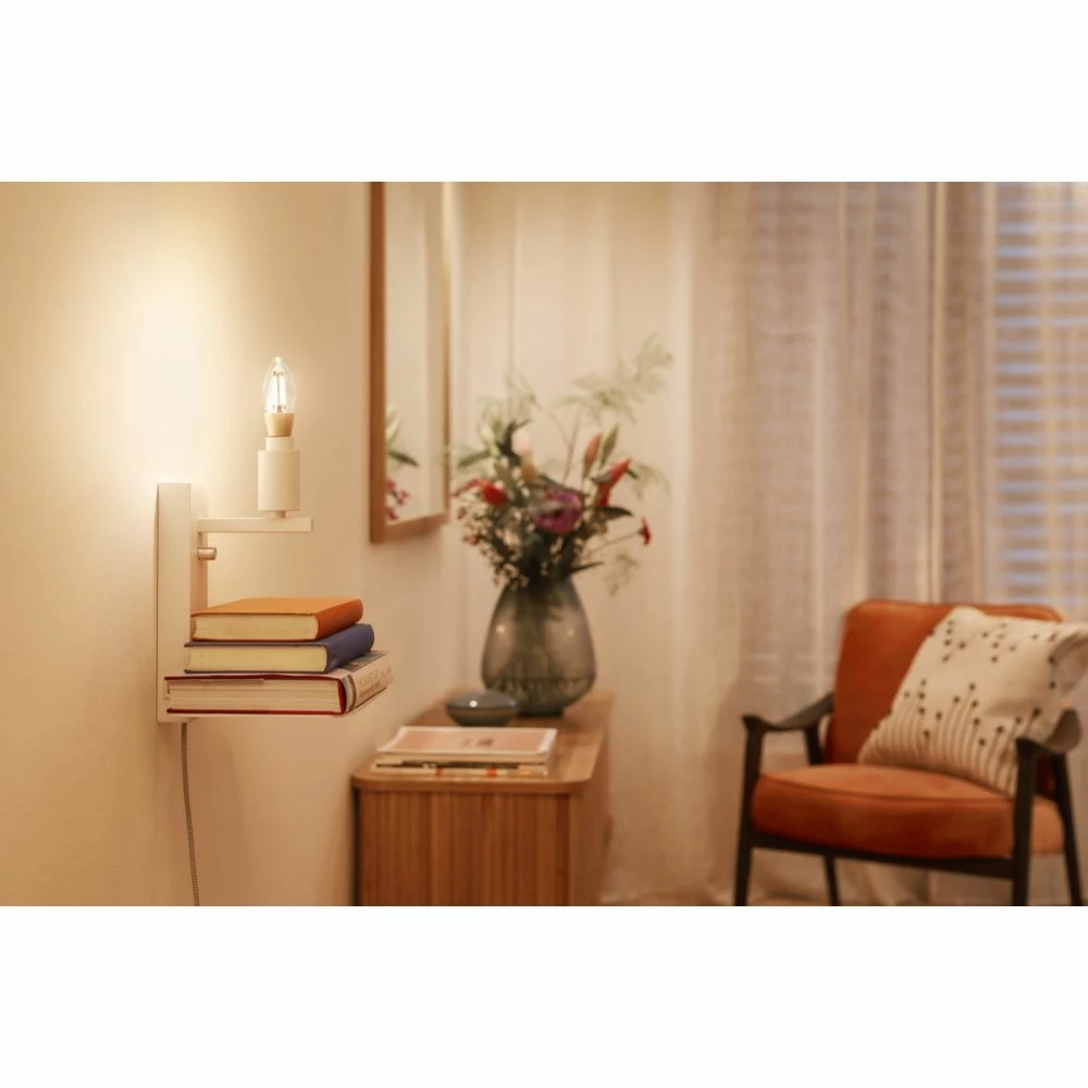 Føj intelligent belysning til dine mindre lamper med den ravfarvede glød fra den justerbare hvide Philips LED Smart Filament kerte pære i vintage-stil med E14 fatning.